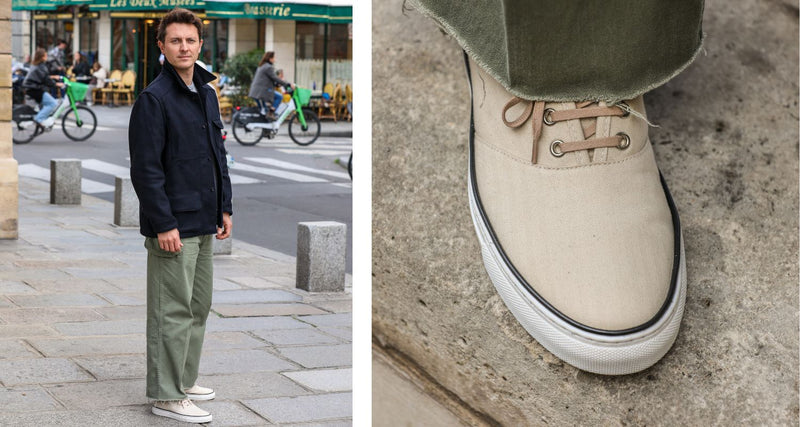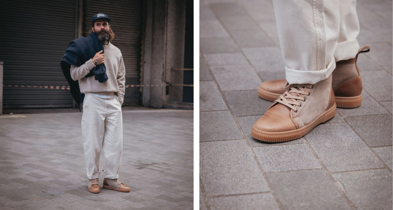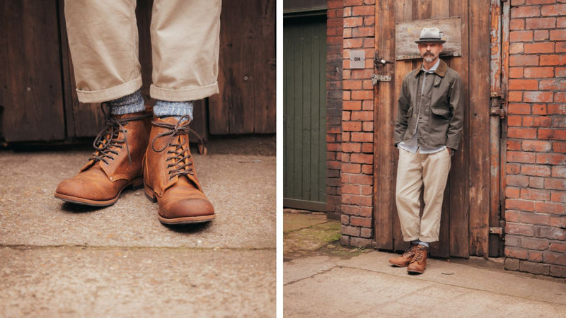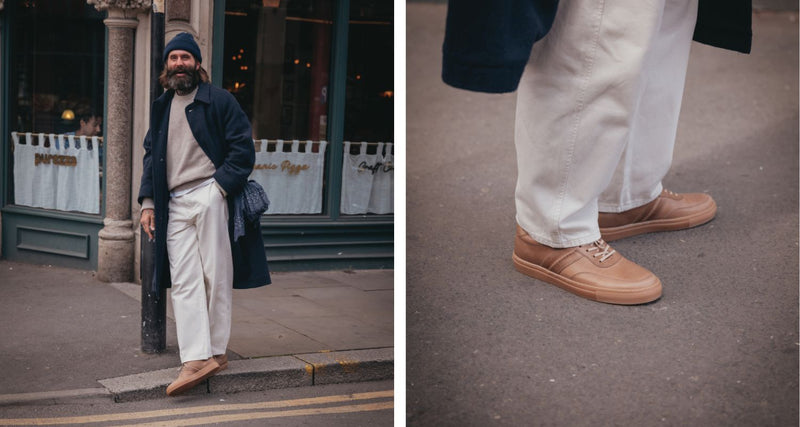 For Christmas Day, layering is key. Ricki teams a navy coat with a neutral jumper and trousers, accessorised with a beanie and a scarf casually tucked from his coat pocket. The shoes really stand out against the outfit tones in Horween's Chromexcel Natural leather.